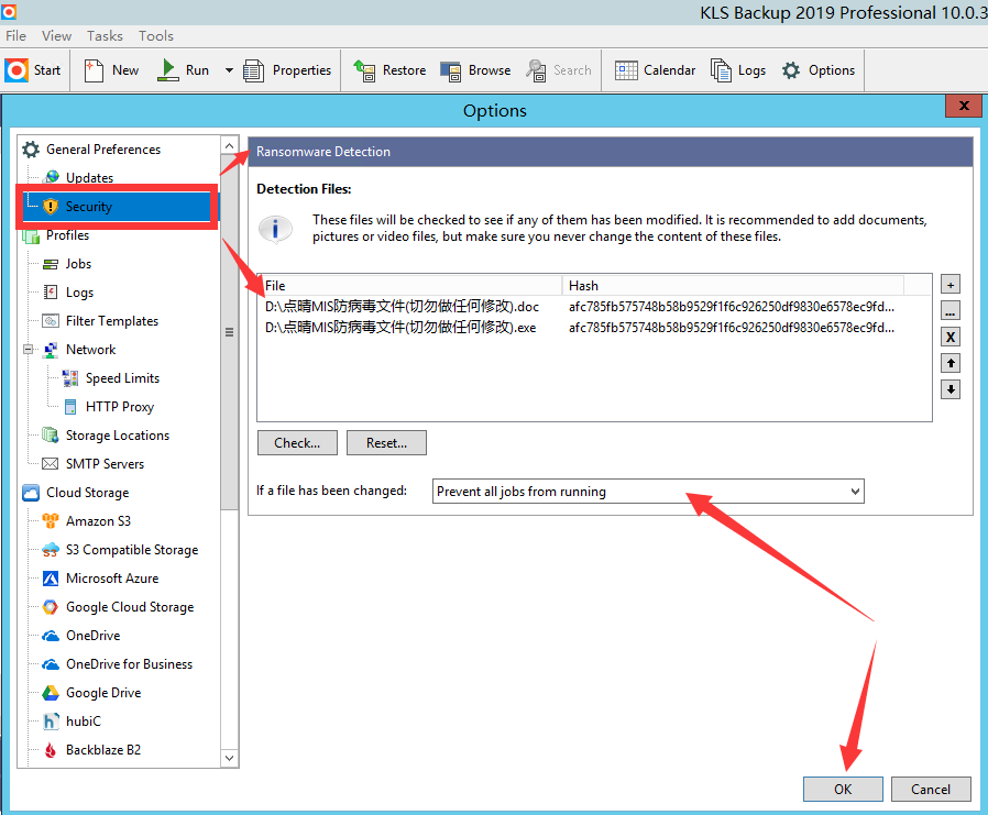 KLS Backup Pro 是一款非常专业的文件备份同步软件。其具备完整备份,增量备份和差异备份三种备份模式、以及超广的系统兼容性,支持 Windows XP/7/8/10/11 和 Windows Server 所有版本,不但可支持指定目录的内容或系统的文件备份到本地物理硬盘、映射硬盘、 CDR、多种网盘或远程FTP服务器上等,其中也还可以采用标准的zip、7z或者SQX等不同格式进行文件存储,以减少存储空间要求,也支持SQL Server、MySQL等多种数据库的备份。 一、下载并安装KLS_Backup根据Windows版本下载安装备份软件“备份软件KLS_Backup_2019”,安装时采用默认设置直接安装即可。 KLS_Backup_V2019(32位版本):地址1、地址2(仅限本地,不提供公网下载) KLS_Backup_V2019(64位版本):地址1、地址2(仅限本地,不提供公网下载) 安装完毕后,务必开启以下功能:Tools-》Option-》General Preferences->Security,选择至少两个文件(一个程序、一个Office文档)监控,但检测到文件被更改时选择“Prevent all jobs from running”(停止所有运行中的任务),避免备份被勒索病毒等破坏。