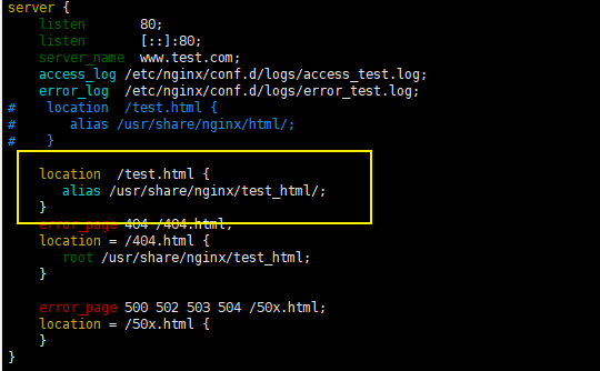 如上图中所示,请求的条件为test.html,通过root指定的路径为/usr/share/nginx/test_html,因此在匹配的时候,这个路径下就必须要有test.html这个文件才可以,否则就会找不到而报错,如果用alias,那么通过浏览器进行请求的时候,alias也是指定到/usr/share/nginx/test_htm路径下,但是会匹配默认的index.html,而无须强制匹配test.html,但是此时就不能使用”=”来进行精确匹配,现在将root改为alias,如图: