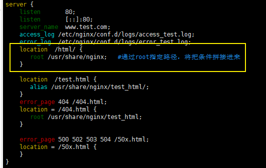 上图中第一个和第二个location匹配条件一样,都是/test.html,但第二个为精准匹配到静态路径,因此第一个不会执行,会执行第二个,www.test.com为本地域名解析,access_log和error_lor可以单独为每个模块定义日志