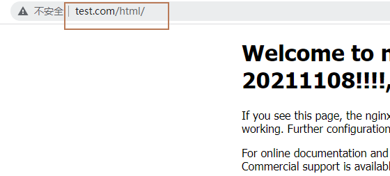 下面的配置文件采用roo指定路径,当通过域名请求http://www.test.com/html/的时候,将跳转到/usr/share/nginx/html/下的index.html页面,如图: