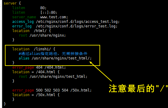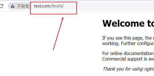 下面的配置文件采用alias指定路径,请求http://www.test.com/linshi/的时候,将跳转到/usr/share/nginx/test_html/index.html页面,如图: