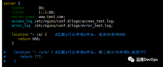 例如:下面配置文件有两条规则,分别匹配url以字母a开头,但是长度不同,首先将长的规则先注释掉,如图: