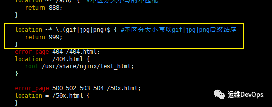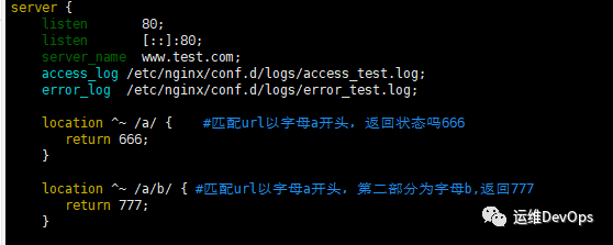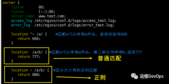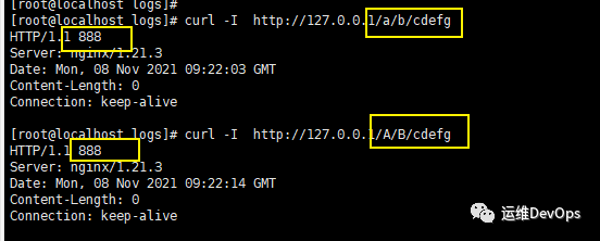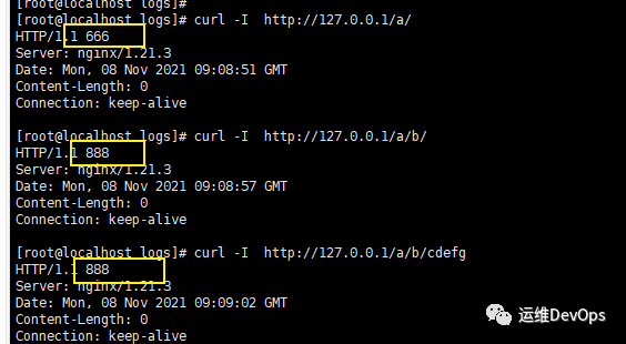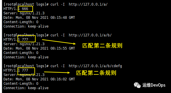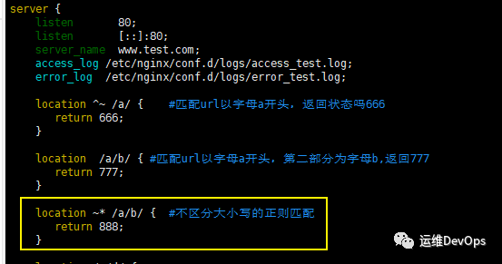 说明:从上图可以看出请求/a/b/的时候,首先会到达第二条规则(最长规则),由于第二条规则为普通匹配(不是^~匹配),因此会继续去匹配正则,也就是第三条规则,因此最终返回状态码为888