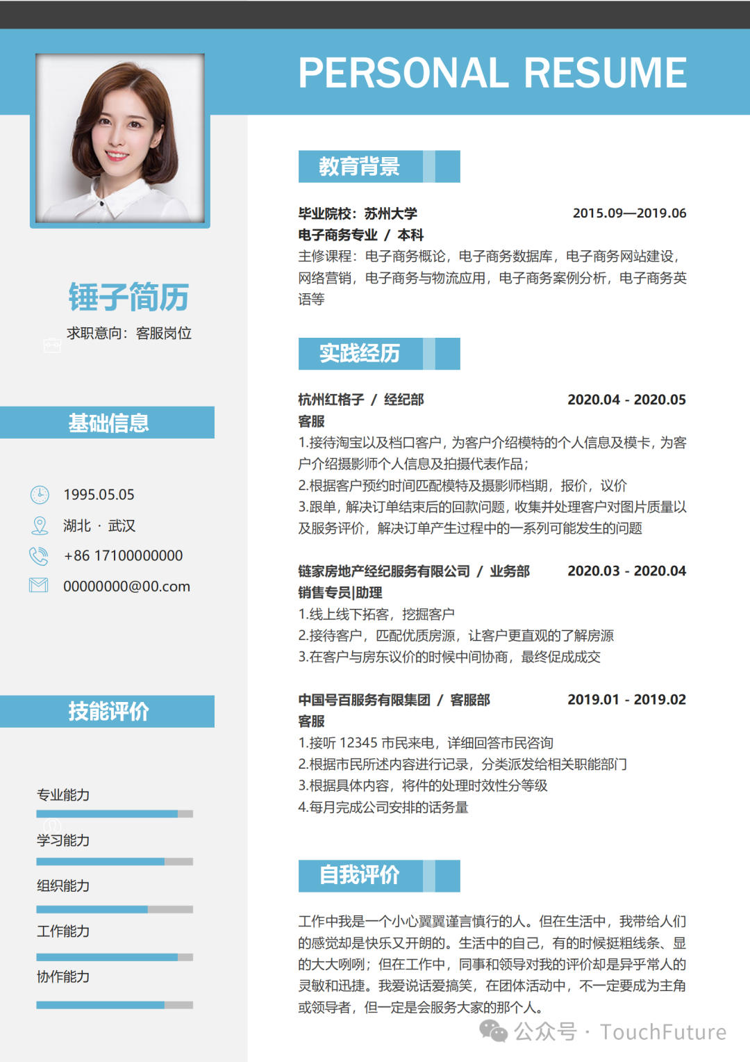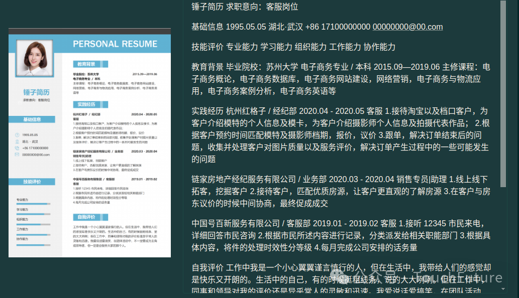 在下面的项目中我们使用下面的2份纯图片形式的求职简历作为输入,来测试OCR模型的识别和提取能力。