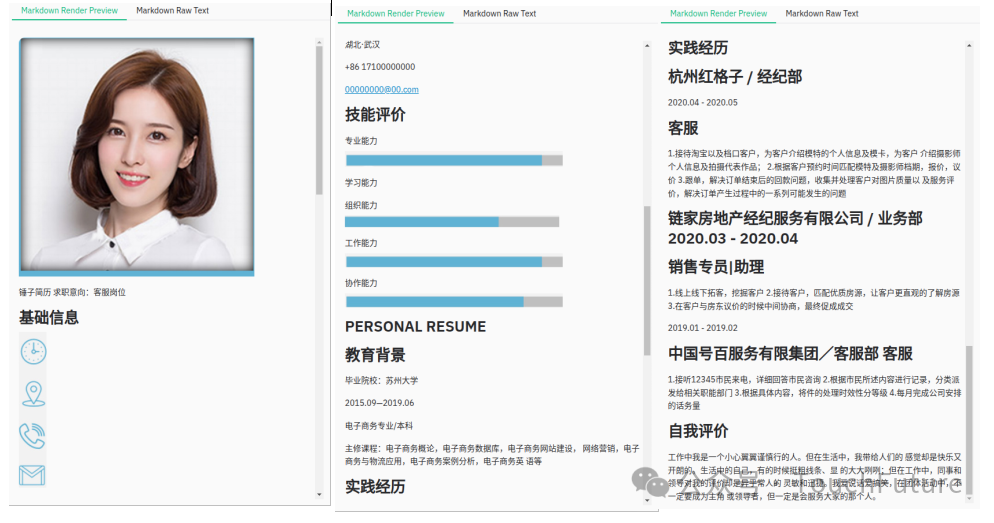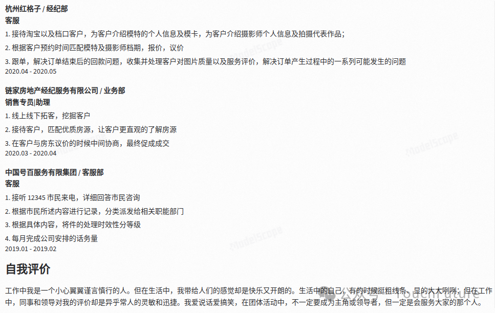 Monkey OCR的信息保留度很高,虽然有些是以图片形式保存了下来,但是文字是文字、图片仅仅是图片而已。而在布局上没有发生混乱,原先简历中的双栏内容,被按由左至右由上至下的顺序正确的识别了,唯一问题是标题级别设置上有偏差。