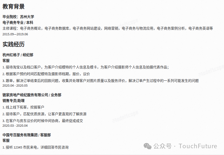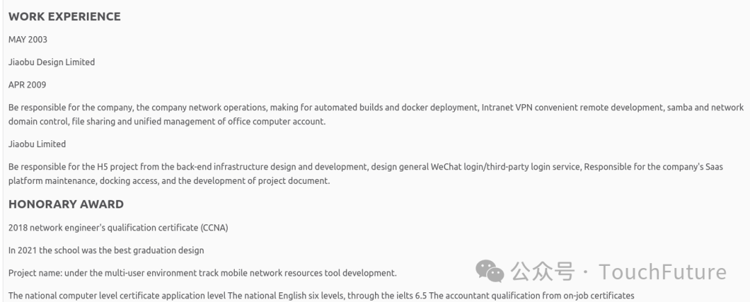 Smol Docling的转换效果,整体上还算可以内容结构上没有混乱,但是在第二段工作经历中丢失了日期信息。