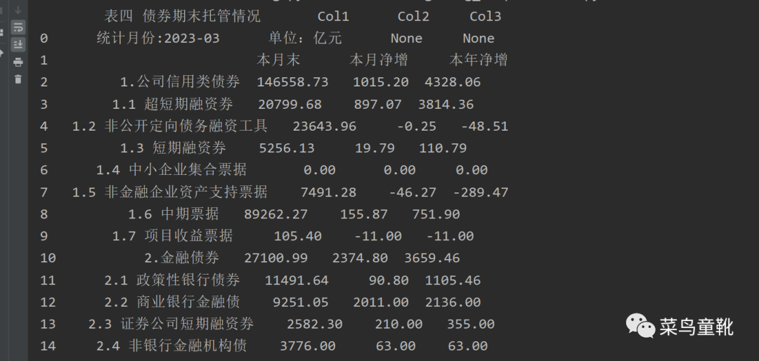 确定好解析文件后,让我们开始编写代码 import fitz root_path = "./表四 债券期末托管情况2023-07-31.pdf" doc = fitz.open(root_path) page = doc[0] # 下标从0开始,第五页对应4 tables = page.find_tables() df = tables[0].to_pandas() print(df) df.to_excel('table.xlsx', index=False)