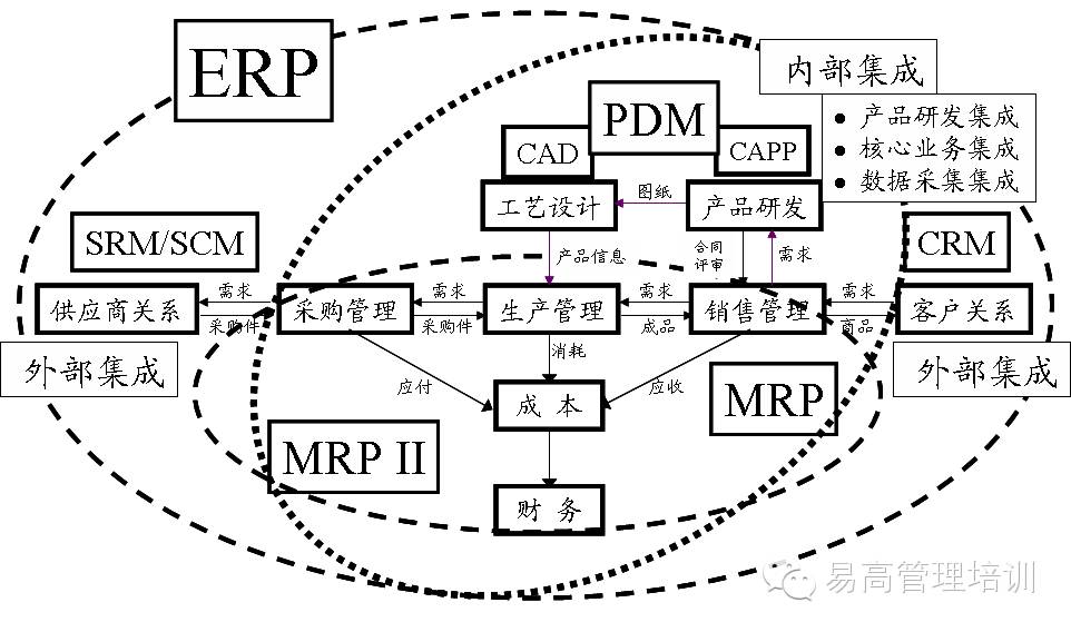 对ERP的发展过程,同样也要从信息集成覆盖的业务流程范围来理解。提出ERP概念的美国Gartner公司对ERP的原始定义是:打破企业四面墙,实现内外信息集成,管理整个供需链,信息集成的范围延伸到企业的上下游,并不是仅限于企业内部管理。对内部集成来讲,Gartner提出3个方面,即同产品研发设计的集成,内部核心业务的集成和数据采集的集成(超出MRP II的范围)。对外部集成来讲,就是同客户和供应商以及各合作伙伴的信息集成,换言之就是供需链集成;覆盖的业务流程范围是相当广阔的。见下图。我国真正实现这一要求的企业还是不是很多,信息化管理的道路还相当漫长,也是人们常说的“信息化没有终点”的道理。