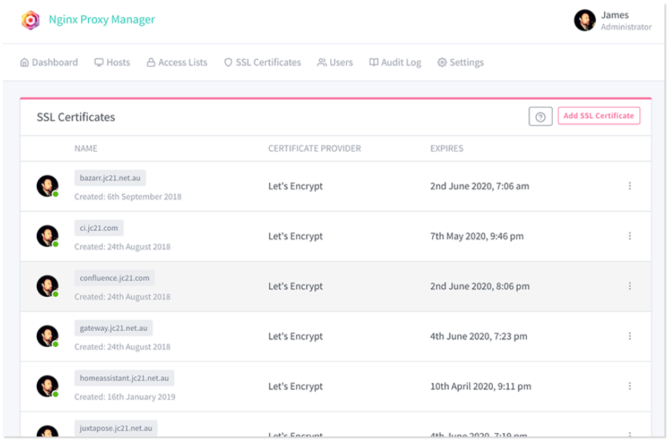 ![]() ![]() 自动化 SSL 证书:内置 Let's Encrypt 支持,可以为你的域名一键申请免费 SSL 证书,并且能够自动续期。再也不用操心证书过期的问题了,省心省力。如果你有自己的商业证书,它也支持上传和管理。 访问控制与权限:可以创建访问列表(Access Lists),限制哪些 IP 地址或者用户可以访问特定的代理主机。还支持基本的 HTTP 用户名密码认证,为你的服务多加一层保护。 支持 WebSocket 和 HTTP/2:对于需要 WebSocket 通信的应用,或者想开启 HTTP/2 提升网站加载速度,Nginx Proxy Manager 都能很好地支持。 Docker化部署:官方推荐使用 Docker Compose 进行部署,简单快捷,环境隔离,不污染宿主机。对于喜欢容器化部署的朋友来说,简直是绝配。 最推荐、也是最简单的方式,当然是 Docker 啦! 只需要创建一个 docker-compose.yml 文件,把官方的示例复制进去, 稍微改改数据卷的映射路径(如果你有特殊需求的话),然后在终端里 cd 到那个目录,执行 等它跑起来之后,用浏览器打开你服务器的 IP:81(默认的管理端口是 81),就能看到登录界面了。 默认的管理员账号和密码在官方文档里也有说明(通常是 admin@example.com 和 changeme),登录进去就可以开始你的可视化 Nginx 配置之旅啦! 阅读原文:原文链接 该文章在 2025/9/1 10:20:25 编辑过 |