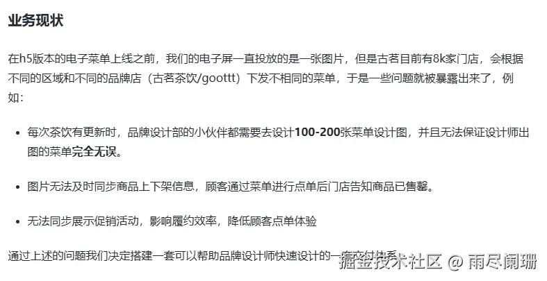 小公司不是那些中大厂,是不会成立项目组来做这些。在人力和精力有限的情况下,如果是固定场景的话,可以找市面上成熟的平台仿照开发,如果是想用lowcode-engine来打造公司通用型平台,直接拒掉... 真实案例除了我司,我再举个真实例子(大道理谁都会说,我始终坚信实践是检验真理的唯一标准) 古茗的前端团队 古茗在面对门店几百张菜单,经常更新的业务现状 开发门店菜单智能化平台搭建电子菜单,切实的实现增效 还是我那句话,它就应该像一把手术刀(工具),为消除某个病瘤(某个场景),精准、简单、快捷的解决问题(降本增效)。 不为解决实际问题开发它干嘛?不如不做... 巅峰看到虚假的拥护,黄昏见证真正的忠诚我从低代码还未大火时便开始研究,见证了它的崛起与沉寂。巅峰时,无数人追捧,仿佛它是解决一切问题的灵丹妙药;而如今,热潮退去,许多人选择离开,我还是孜孜不倦的探索我的眼中的低代码。 写这篇文章就是想对低代码祛魅,拨开层层糖衣看看它真实的模样。它没外界吹捧的那么无所不能,但也并未一无是处。 一去数年,我仍在低代码的道路上独自求索,构建自己的理想国。 诸君共勉 ~ 转自https://juejin.cn/post/7468621394736922662 该文章在 2025/9/10 11:51:40 编辑过 |