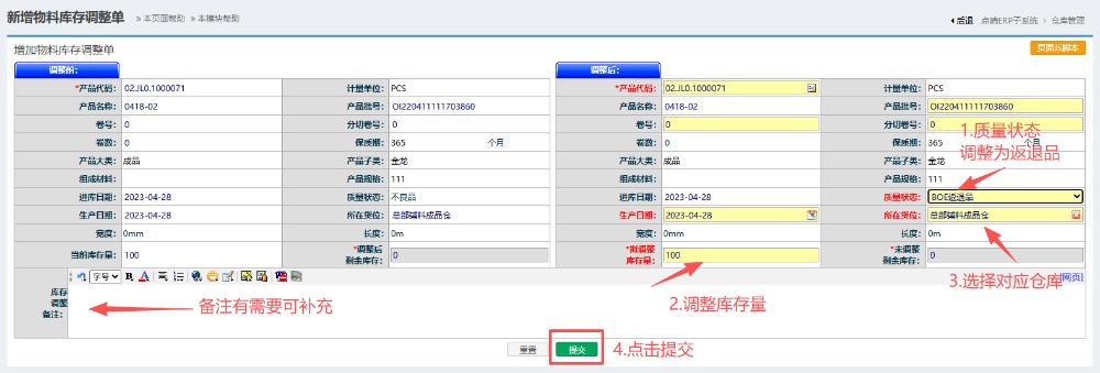 ![]() ![]() 本教程是针对BOE成品返退流程中返退来源为“自主重工”,需要进行物料状态调整。 注:如果是正常BOE返退品的话可直接到最下方的“BOE返退品流程”! 1.进入ERP系统之后,在左侧的功能菜单里找到“仓库管理”,点开“物料在库管理”,点击“新增物料状态调整单”。 2.进入界面后,按图操作:物料大类选择成品,点击查询。然后点击对应物料信息,点击增加调整单。 在调整单界面内,按图操作:质量状态调整为BOE返退品,调整库存数量以及选择对应的仓库。最后点击提交。