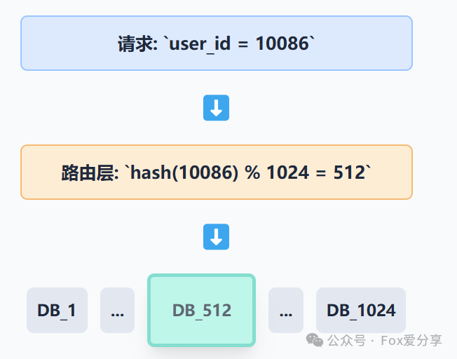 为10086的待收货订单”的请求,会被路由层精确地导向存储该用户数据的那个库,比如db_512