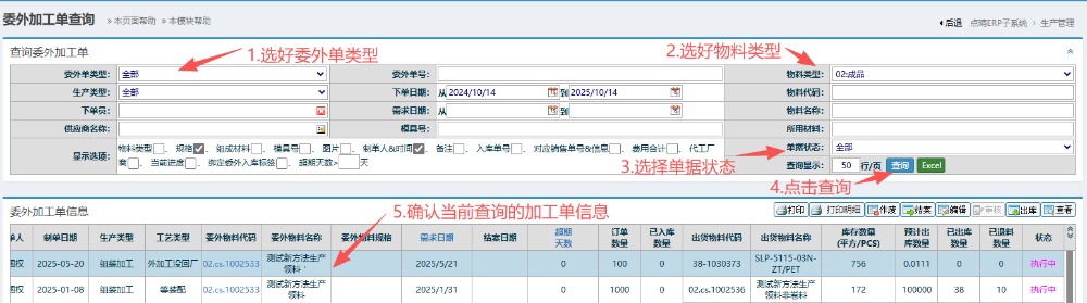 2.进入页面后,按图操作:选好委外单类型、物料类型以及单据状态,然后点击查询。在下方得到当前确认的加工单信息。 点晴模切ERP更多信息:http://moqie.clicksun.cn,联系电话:4001861886 该文章在 2025/10/14 15:45:34 编辑过 |