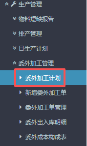 1. 进入ERP系统之后,在左侧的功能菜单里找到“生产管理”,点开“委外加工管理”,点击“委外加工计划”。