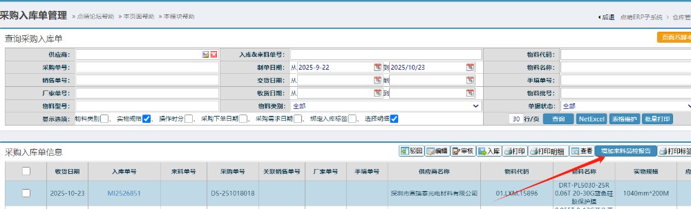 然后重新在“仓库管理”》“物料入库管理”》“采购入库管理”里点击查询,找到对应物料信息,在右上方重新点击“增加来料品检报告”