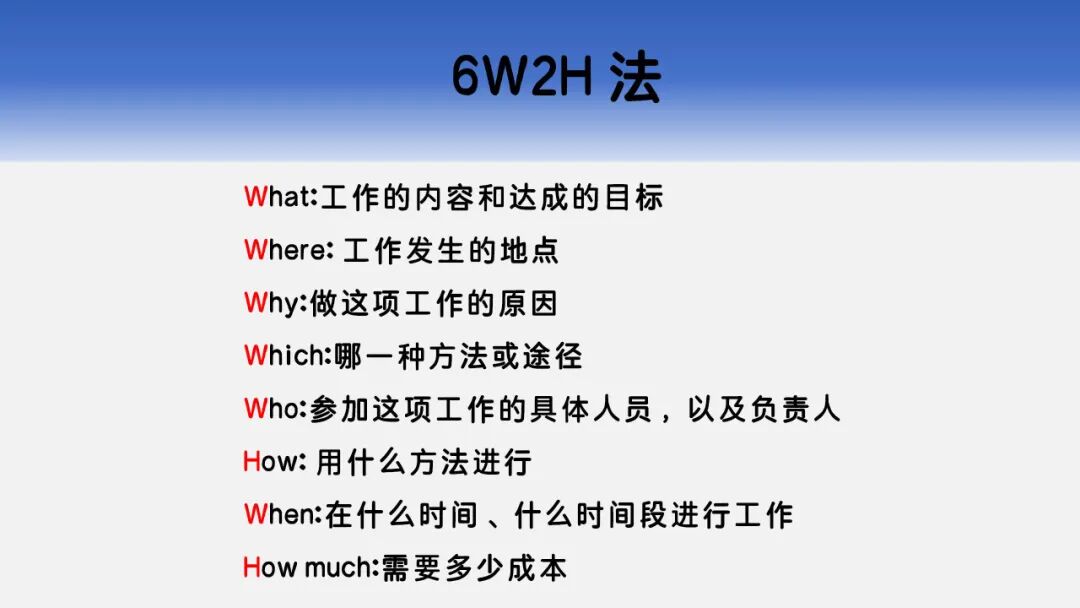 制定营销方案、生产改进计划、客户服务流程,甚至一次会议筹备,都可以用 6W2H 来确保考虑全面。对于个人来说,从规划一次旅行到制定职业规划,都可以用它梳理思路。