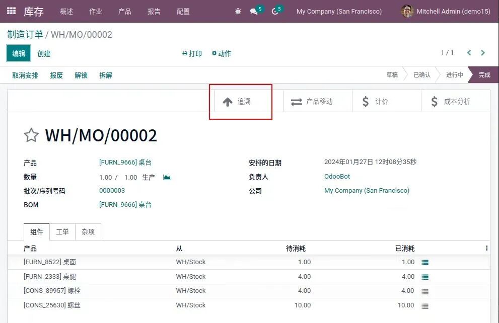 首先,通过采购系统采购材料。当库存达到最低阈值时,会提前设置自动补货行为订购组件,否则将手动创建采购订单。在物料到达仓库之前,手动输入或使用条码扫描记录批次和序列号。根据企业制造业务的物料流配置多个仓库和楼层。每当物料从一个位置(如仓库)转移到另一个位置(如制造车间)时,都会自动生成追溯报告,从而允许在下游过程中追踪物料: